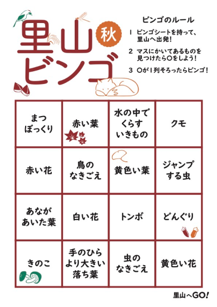 里山でビンゴをしながら 自然観察しぜんかんさつを楽しもう! 友だちや家族みんなとやれば、 盛もり 上あがることまちがいなし!