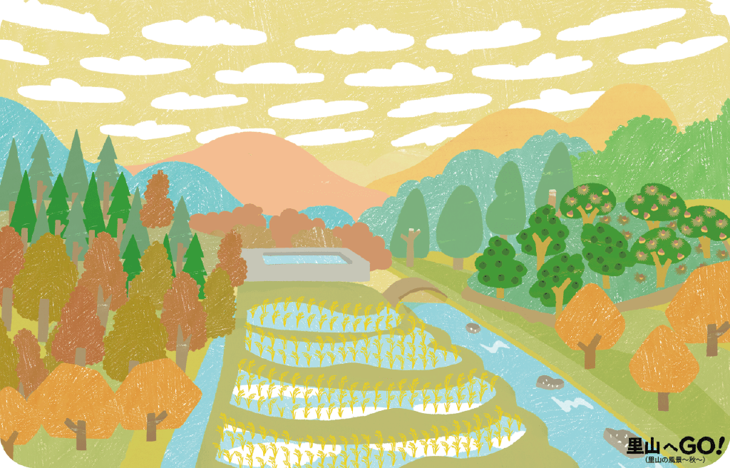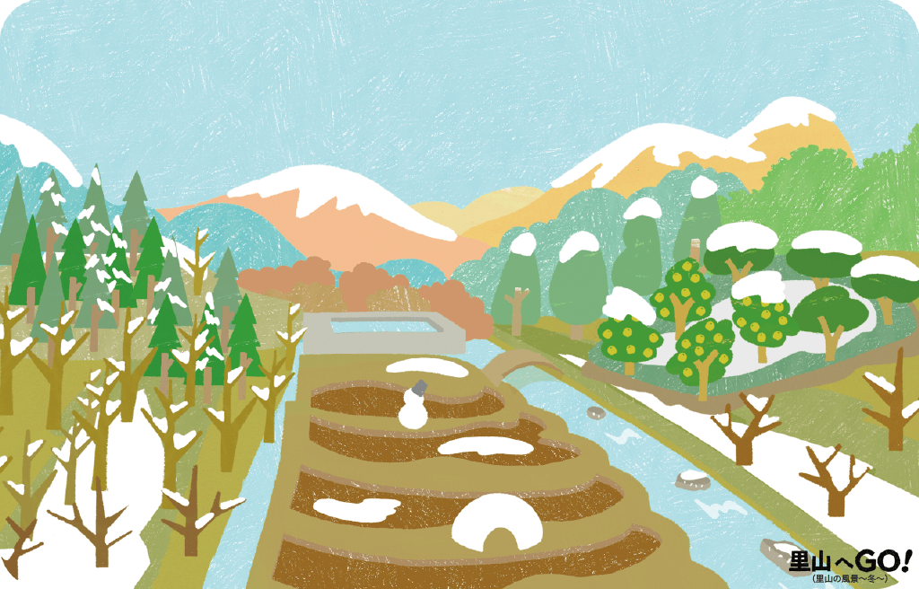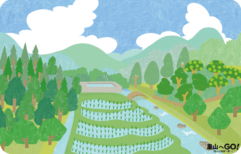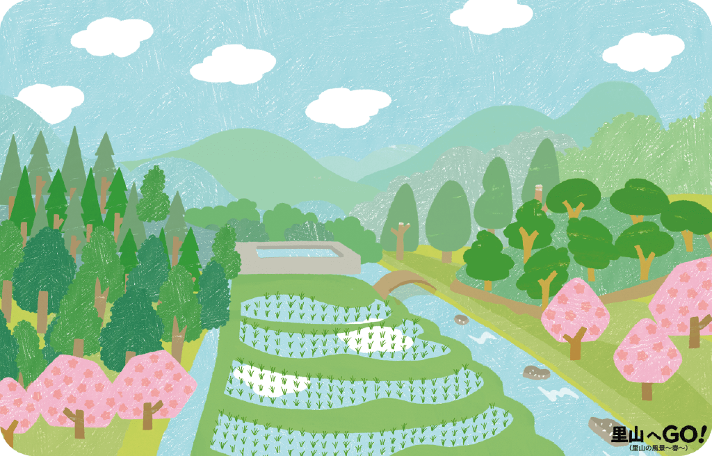 里山にはどんな四季しきやいきものがおとずれるかな? 里山で出会える風景ふうけいや、いきものを好きな色でぬって楽しもう!