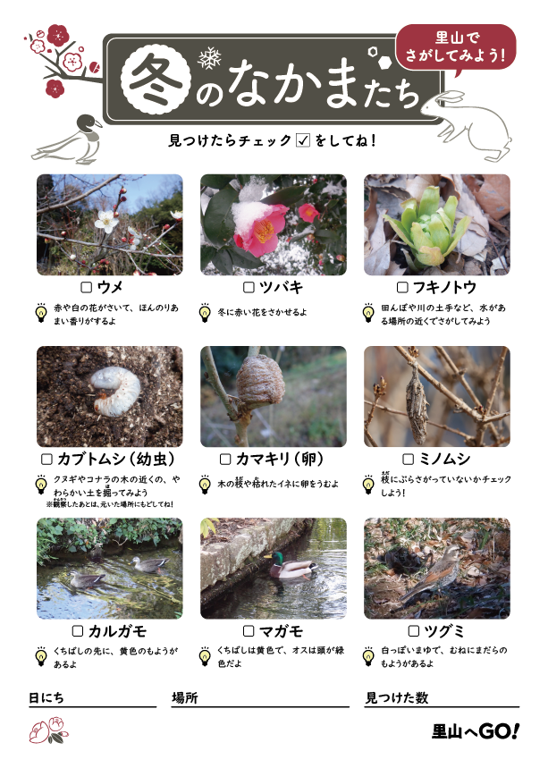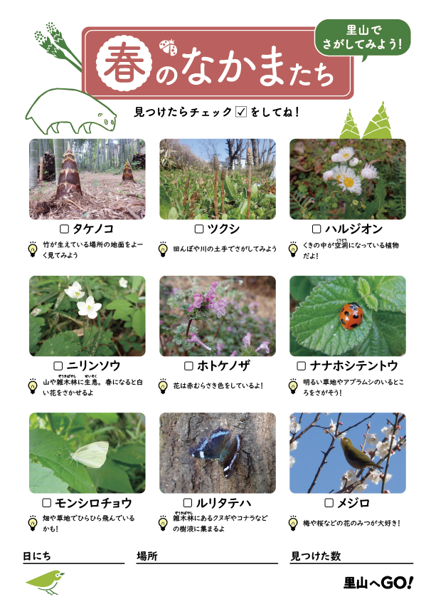 里山ではどんないきものに会えるかな? このシートを持って里山へ会いにいってみよう!