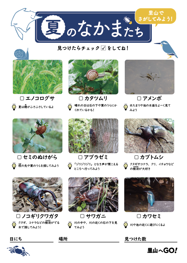 自然観察しぜんかんさつや自由研究に役立つシートを作ったよ! プリントしたシートを持って、里山へ遊びに行こう!