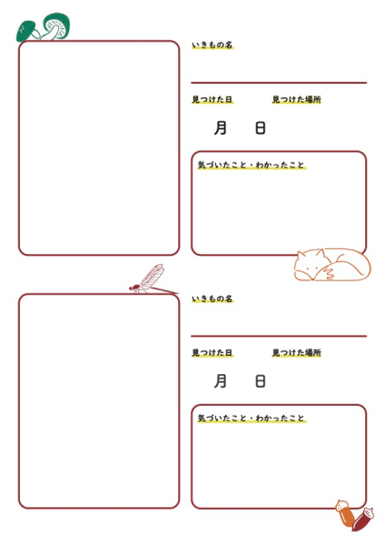 里山で見つけたいきものの写真をはったり、場所や 特徴とくちょうを書いたりして、 自分だけのいきものずかんを作ろう!