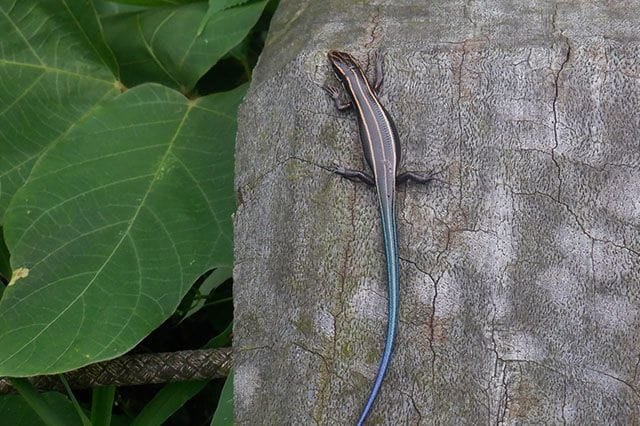 体の大きさは60~100mm。しっぽは青色で、長さは体の1.5~2倍あります。敵(てき)から身を守るときは、しっぽを切りはなしてにげます。日当たりのいい場所を好み、クモやミミズなどを食べます。