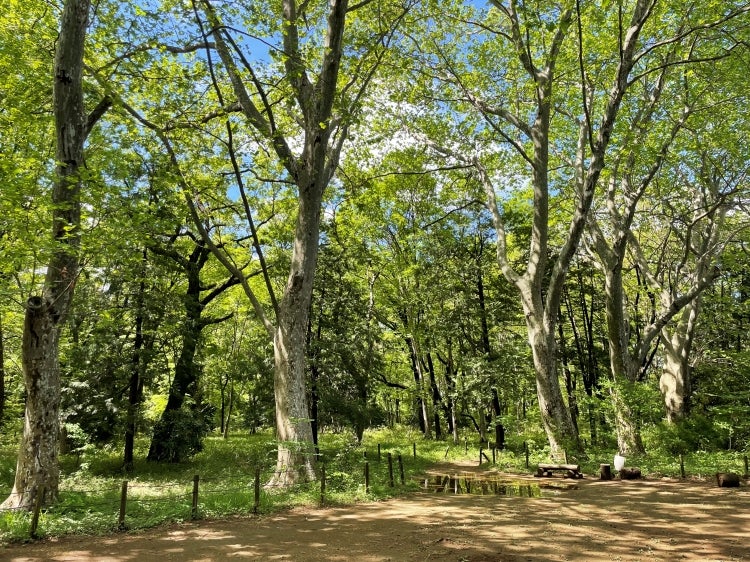 西武線清瀬駅から徒歩10分、清瀬市の南西部にある里山です。南側はアカマツを主体とした雑木林で、中央部から北側・東側には草地と、サワラやプラタナス並木等の樹木が並んでいます。もとは人為的な植栽であった樹林が保存され、樹形の美しい大木が生育し、多くの野鳥も観察されています。
