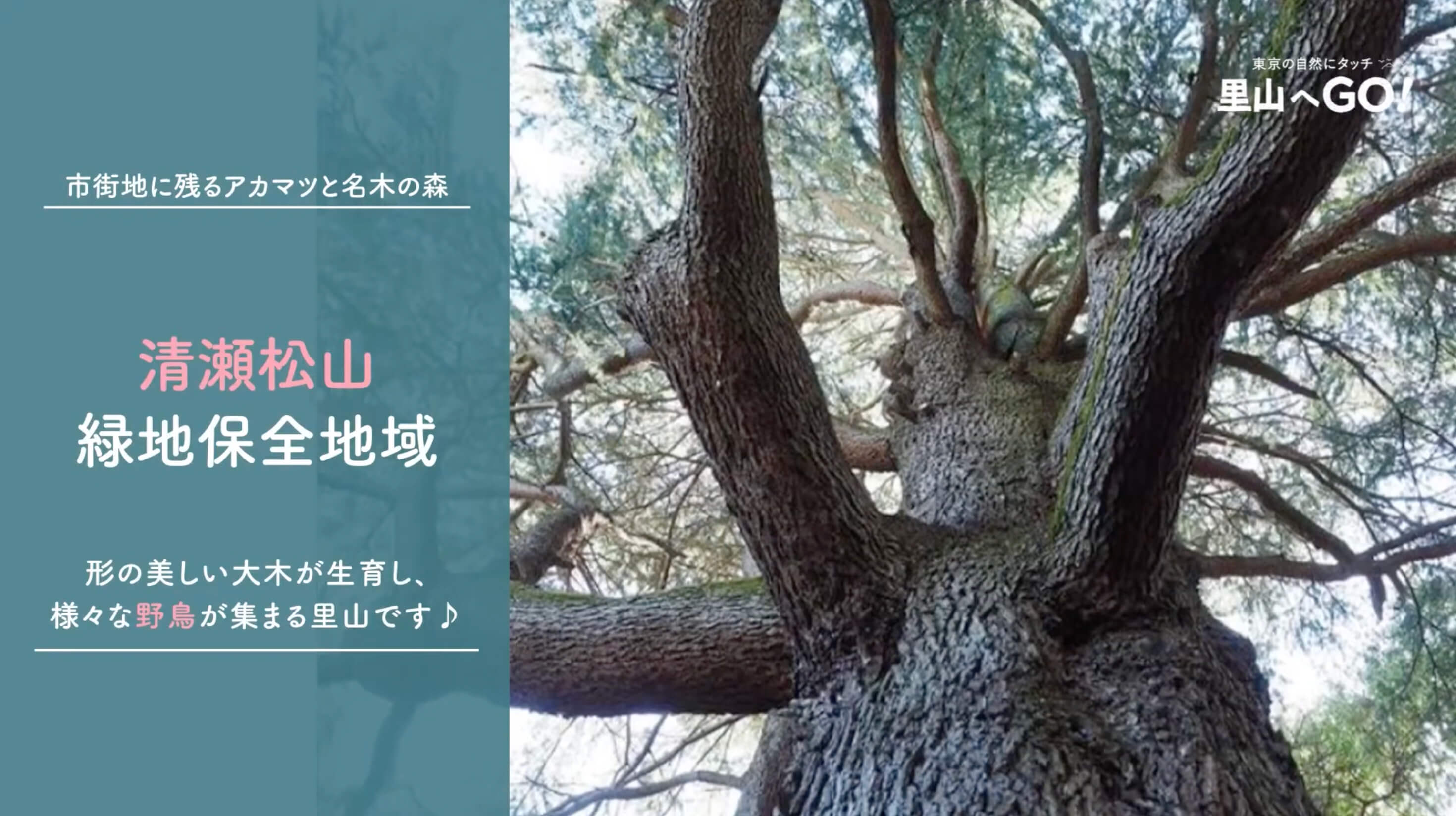 西武線清瀬駅から徒歩10分、清瀬市の南西部にある里山です。南側はアカマツを主体とした雑木林で、中央部から北側・東側には草地と、サワラやプラタナス並木等の樹木が並んでいます。もとは人為的な植栽であった樹林が保存され、樹形の美しい大木が生育し、多くの野鳥も観察されています。