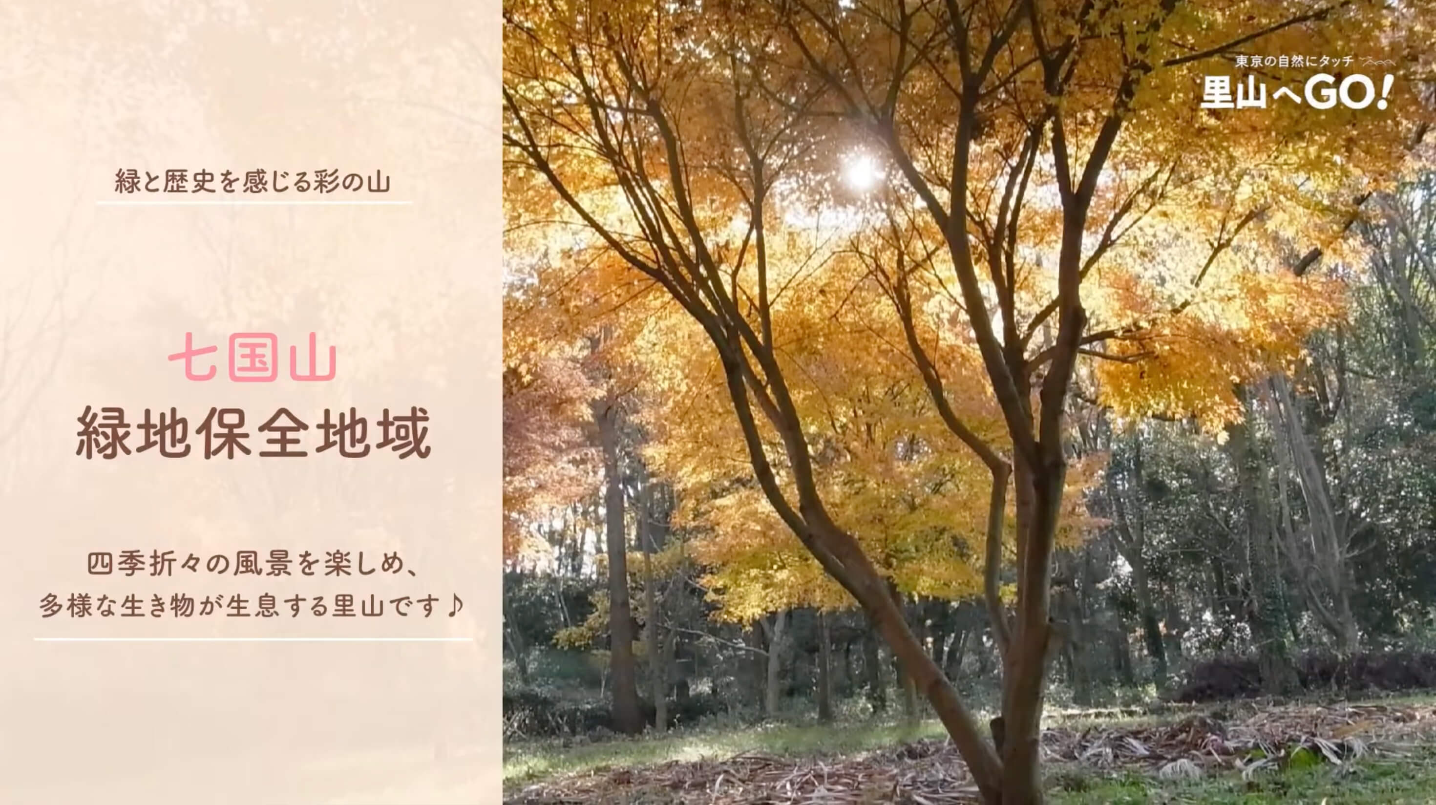 町田駅または鶴川駅からバスと徒歩で約30分、町田市のほぼ中央部にある里山です。クヌギ・コナラの雑木林に、畑、果樹園、竹林などが散在し、数条の尾根と谷戸が入り組んだ変化に富んだ地形を持っています。標高128.6mの山頂から七つの国が見えたことから名付けられたとの言い伝えがあります。西部には「鎌倉古道」の遺構が南北に縦貫しています。